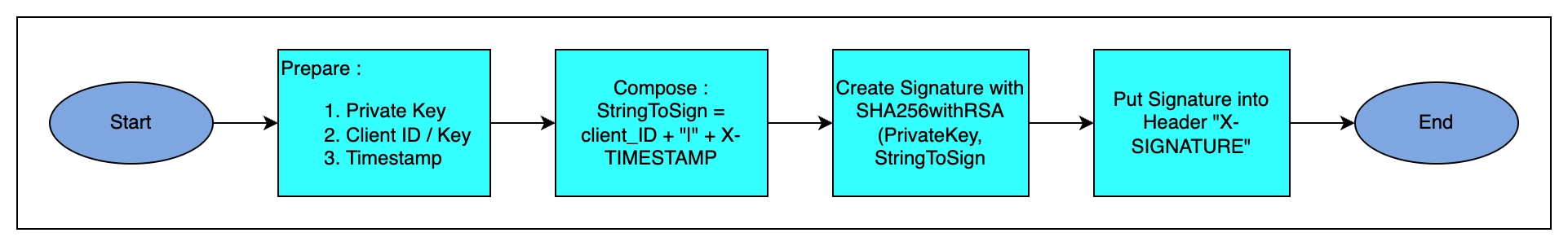 | X-SIGNATURE | String (Required) | Created using asymmetric signature SHA256withRSA algorithm. SHA256withRSA(PrivateKey, StringToSign). *StringToSign = client_ID+"|"+X-TIMESTAMP |